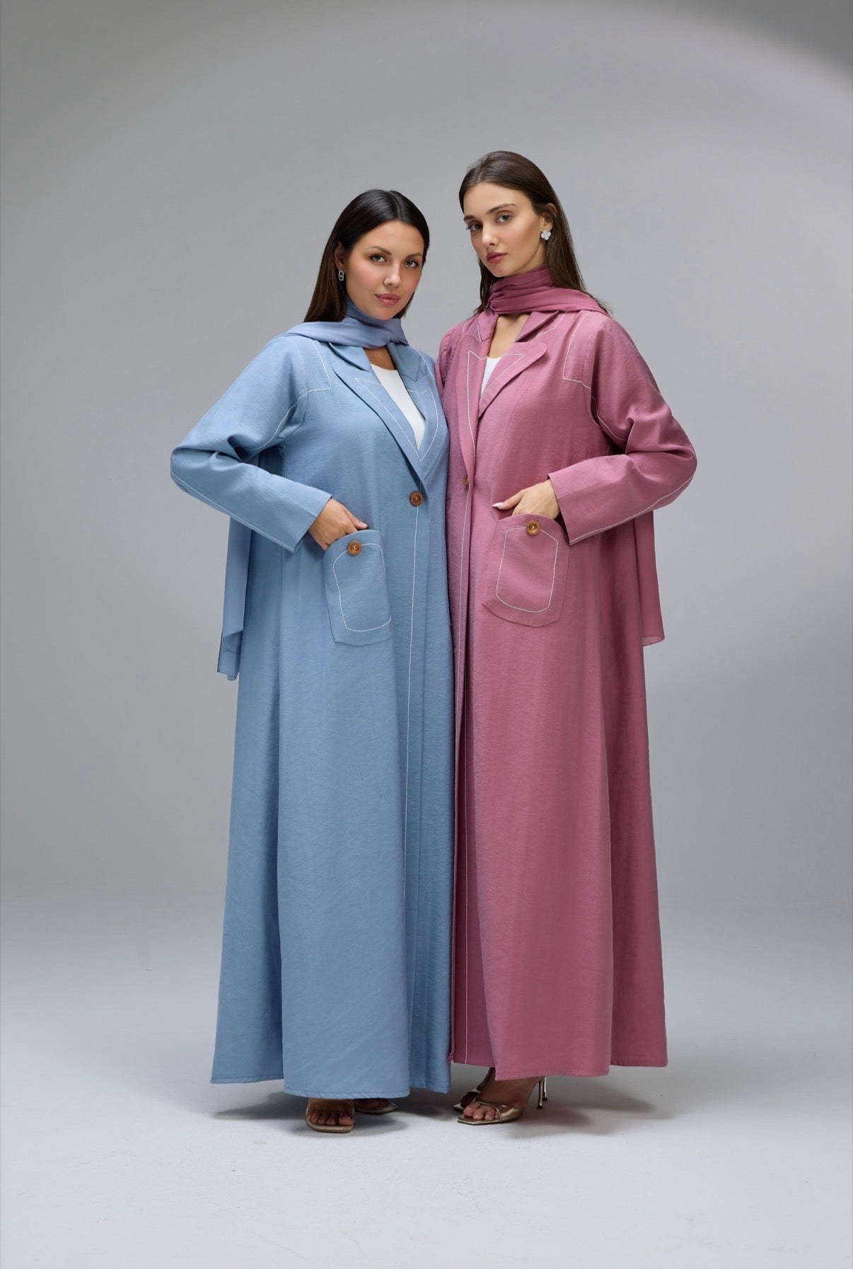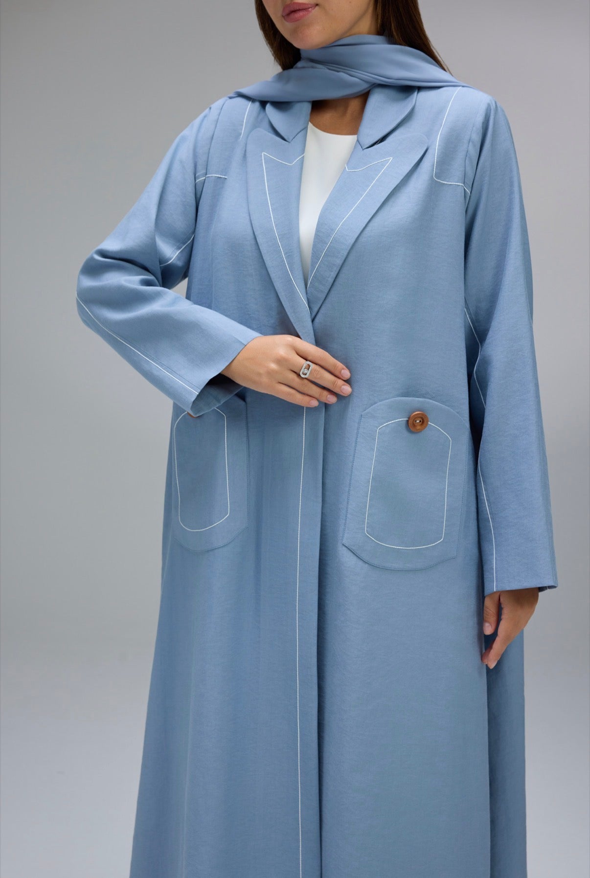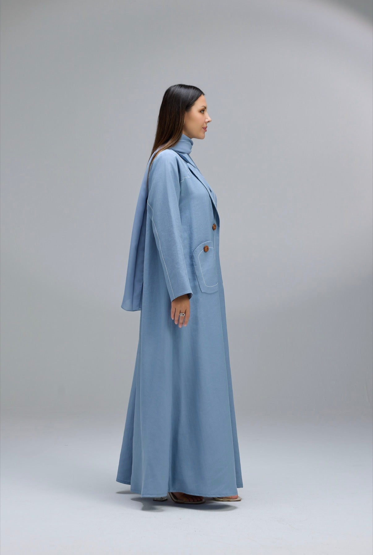 Experience effortless elegance with this soft linen abaya, featuring delicate thread lines stitching with buttons on pocket that adds a touch of sophistication.